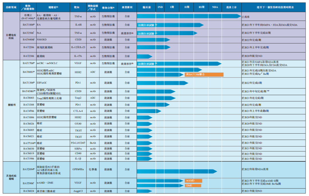 除了格乐立,公司产品中上市进程最快的是安维汀生物类似药BAT1706(贝伐珠单抗)。BAT1706是百奥泰根据中国 NMPA、美国FDA和欧盟EMA生物类似药相关指导原则开发的贝伐珠单抗注射液,适应症包括晚期、转移性或复发性非小细胞肺癌(nsNSCLC)和转移性结直肠癌(mCRC)。目前国内上市申请已于2020年6月获受理。
