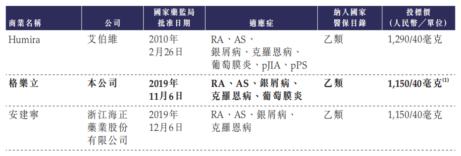 格乐立为一款阿达木单抗生物类似药,于2019年11月获得上市批准,适用于强直性脊柱炎、类风湿关节炎、银屑病、克罗恩病和葡萄膜炎。格乐立于2020年1月开始销售。