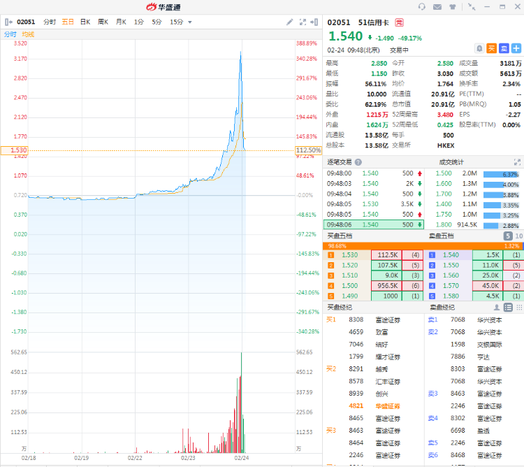 2月24日消息,51信用卡持续走低,现跌49.17%,暂居跌幅榜首,最新市值20.91亿港元,该股昨日收涨236.67%位居涨幅榜首。
