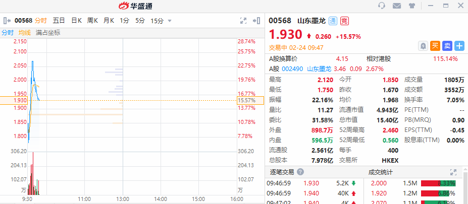 华盛资讯2月24日消息,山东墨龙早盘高开高走,盘中一度涨超20%。截至发稿,该股涨15.57%,现报1.93港元每股,暂成交3552万港元。年初至今,该股累计上涨超130%。