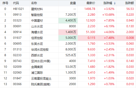 华盛资讯2月24日消息,建筑材料板块今日再度走高,领涨所有板块。截至发稿,智勤控股涨超10%,中国建材涨超7%,山水水泥涨超6%,海螺水泥涨超4%,华润水泥控股涨超2%。