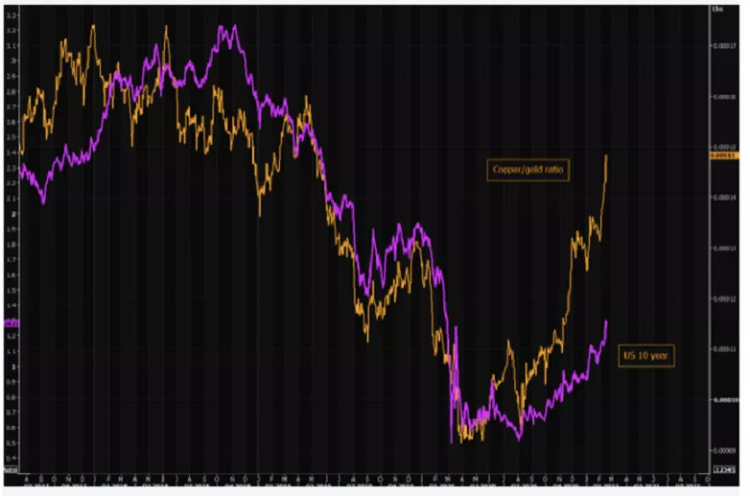 很明显,两者是强相关,而铜/金比例曲线如此快速拉升,也暗示了美债收益率后续还要拉升。