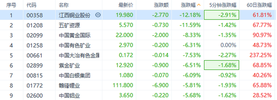 2月24日消息,港股有色金属板块集体下挫,江西铜业股份跌超12%领跌,五矿资源跌超11%,中国黄金国际跌超8%,中国有色矿业跌超6%,紫金矿业跌超6%,山东黄金跌超4%。