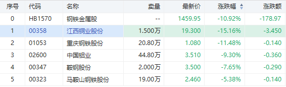 华盛资讯2月24日消息,钢铁金属股午后全线大幅走跌,截至发稿,江西铜业跌超15%,重庆钢铁跌超11%,中国铝业跌超9%,鞍钢股份跌超7%,马鞍山钢铁跌超5%。