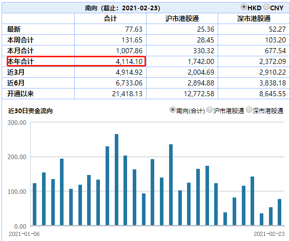 2021年南下资金持续流入创下历史记录也引起了市场高度关注,截至2021年2月23日,港股通南向资金净流入总金额已经达到4114.1亿港元。