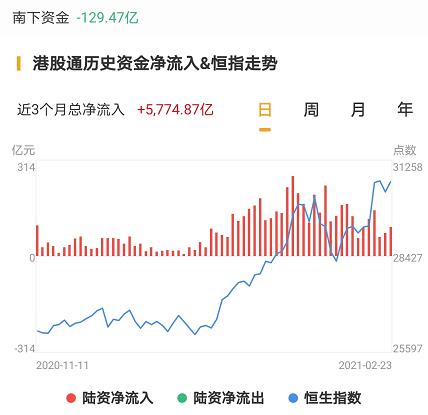 南下资金今日净流出港股高达129.47亿港元,创历史新高,为2020年12月18日以来首次净流出。