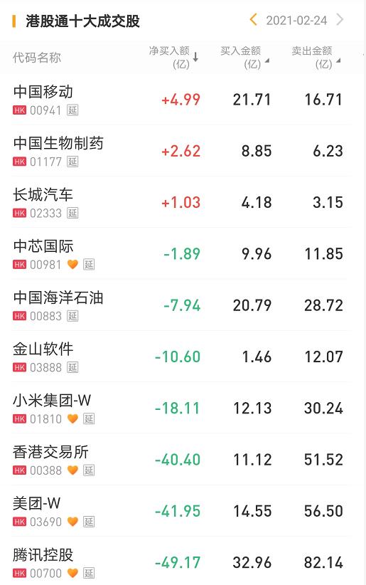 个股方面,今日南下资金净买入中国移动4.99亿港元,为今日买入之最。此外,南下资金净买入中国生物制药2.62亿港元,净买入长城汽车1.03亿港元。