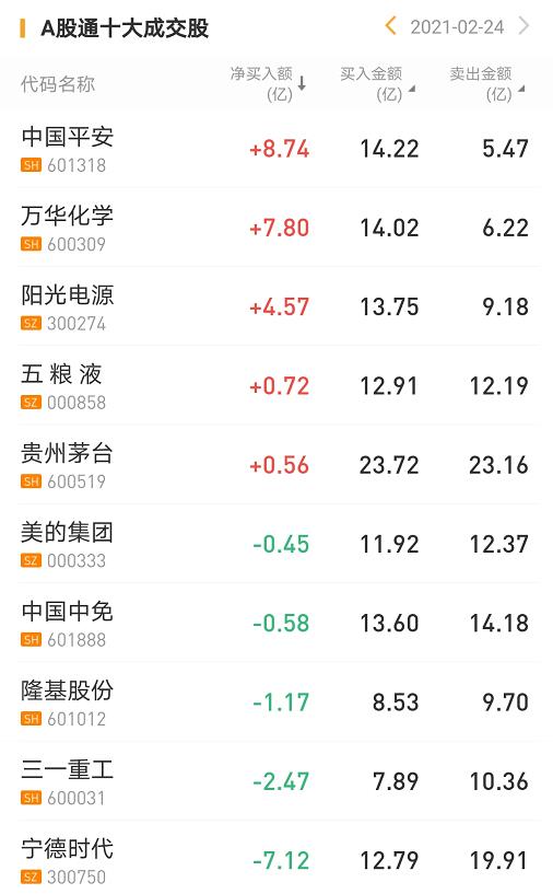 北上资金今日净买入中国平安8.74亿元,为今日买入之最。此外,北上资金今日净买入万华化学7.80亿元,净买入阳光电源4.57亿元。