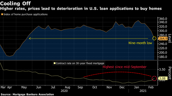 美国抵押贷款银行家协会周三表示,截至2月19日的一周,抵押贷款申请指数下跌11.6%至264.9。30年期固定抵押贷款利率从2.98%升至9月中旬以来最高水平3.08%。