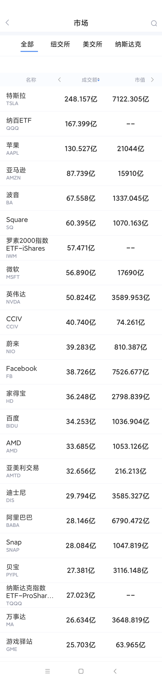 特斯拉继续稳居成交额冠军,其成交额达248.2亿美元。该股周三收盘大涨6.2%,此前方舟投资管理公司(Ark Investment Management)有着“女股神”之称的Cathie Wood表示,她在周二的美国股市暴跌中买入了价值超过1.2亿美元的特斯拉股票。