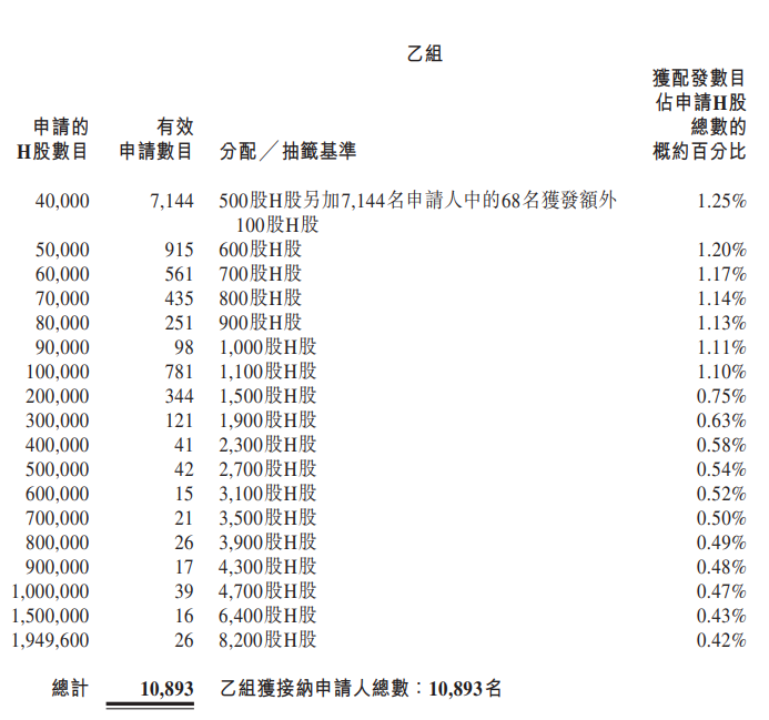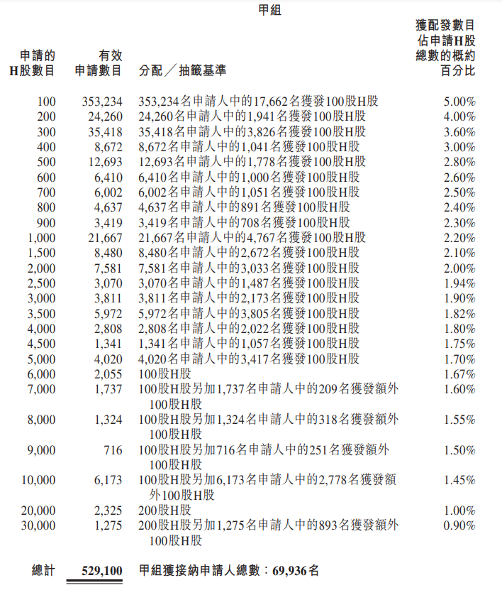 香港公开发售项下初步提呈发售的香港发售股份已获非常大幅超额认购。合共接获539,993份根据香港公开发售提出的有效申请,认购合共1,208,990,300股香港发售股份,相当于香港公开发售项下初步可供认购的香港发售股份总数 3,899,300股的约310倍。由于该等重新分配,公开发售项下可供认购的发售股份最终数目已增加至1559.7万股,占发售股份数目约36%(于任何超额配股权获行使前)。