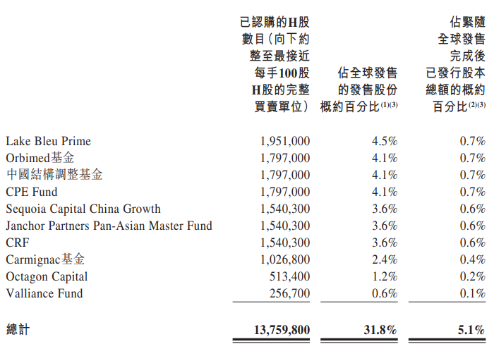 根据基石投资协议,基石投资者已认购13,759,800股发售股份,相当于紧随全球发售完成后公司已发行股本约5.1%,及相当于全球发售项下发售股份数目约31.8%(假设超额配售权未获行使)。