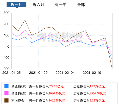同时,这也是南向资金自2020年12月18日以来的首次净流出(见下图)。此前1月份,南向资金曾爆买港股3000亿,2月份资金流入有所减弱,但仍累计买入超800亿元。