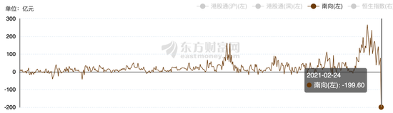 但更加令人感兴趣的是,之前源源不断持续流入港股市场的南下资金。在2月24日,出现历史性大撤退,超过200亿资金撤离。