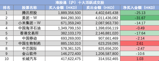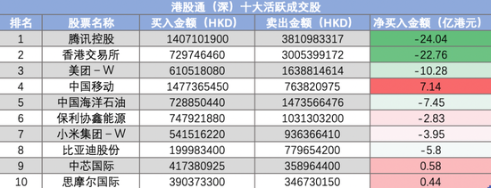 其中腾讯控股净卖出24亿元,香港交易所净卖出23亿元,美团-W净卖出10亿元,中国海洋石油净卖出7亿元,比亚迪股份净卖出6亿元;中国移动净买入7亿元。