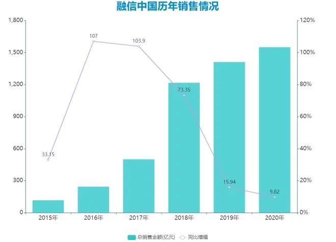 于2015年至2020年,融信分别录得合约销售金额为119.17亿元、246.39亿元、502.35亿元、1218.84亿元、1413.17亿元和1551.73亿元;销售同比增幅分别为33.15%、107%、103.9%、73.35%、15.94%和9.82%。