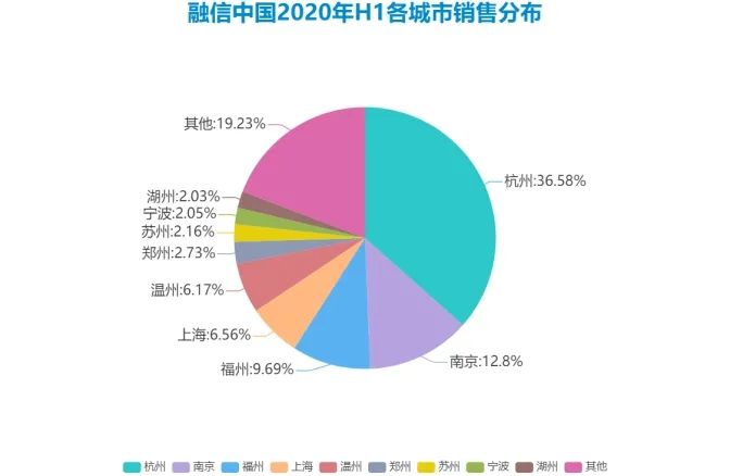 2020年上半年,融信销售贡献排名前五城市分别是杭州、南京、福州、上海和温州。其中,仅杭州一座城市就为融信贡献出了220.79亿元销售额,在销售总额中占比36.58%。剩下的福州和上海,销售贡献占比分别为9.69%和6.56%。
