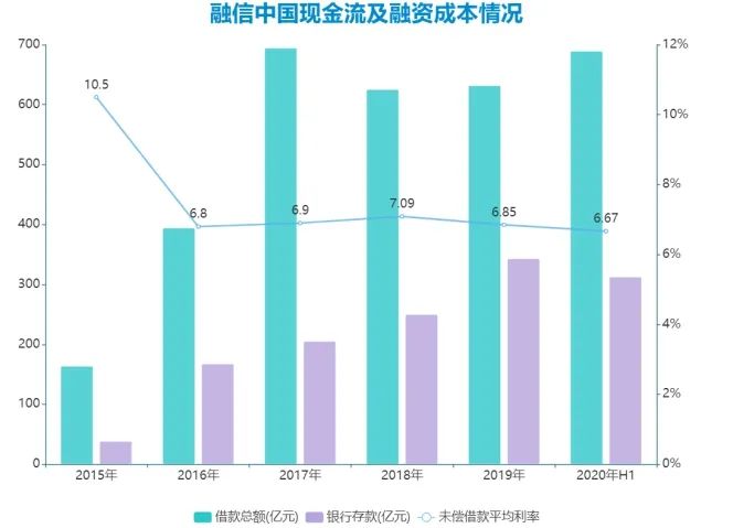 2019年末,融信借款总额约为631.78亿元,同比微增1.03%;到了2020年上半年,借款总额约为689.37亿元,较上年末增长了9.12%。