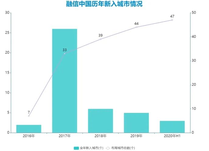 截至2020年上半年,融信在47个城市共布局了219个项目,其中仅有三个项目为商业或办公项目,其余均为住宅。