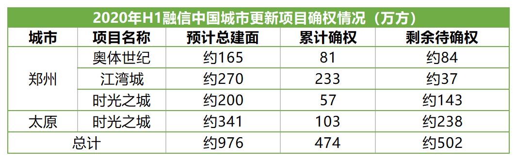 截至2020年上半年,融信陆续通过分布在郑州、太原等地的4个城市更新项目,累计确权了约474万平方米的土地储备。