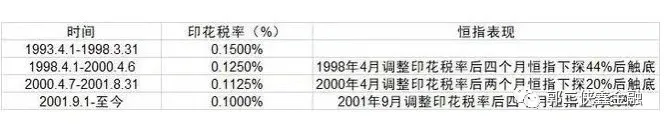 自1993年以来,香港股票交易印花税4次下调。其中,1998年4月调整后四个月,恒指下探44%后触底;2001年9月调整后四个月,恒指累计上涨30%,可见印花税的调整并无法改变整体市场趋势。