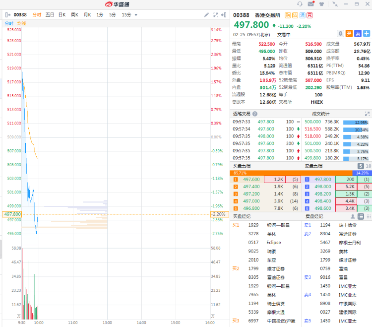 2月25日消息,港交所跌超2%,现报497.8港元,跌穿500港元,最新市值6311亿港元。