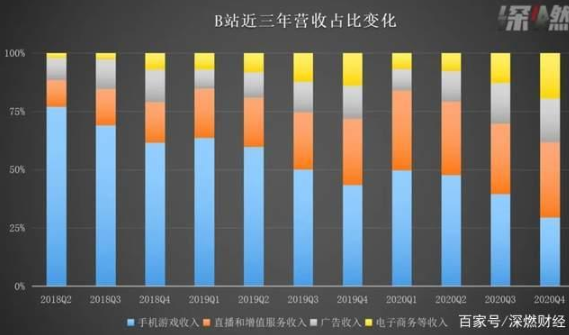 破圈也的确为B站带来了一部分好的变化。从营收结构来看,B站调整效果显著。要知道在2018年上市时,其招股书显示的二次元游戏占其2017年全年收入的83%,而现在,截至2020年Q4,已经连续六个季度除游戏收入以外的其他收入,占比超过50%以上,Q4游戏占比已经下滑至30%。