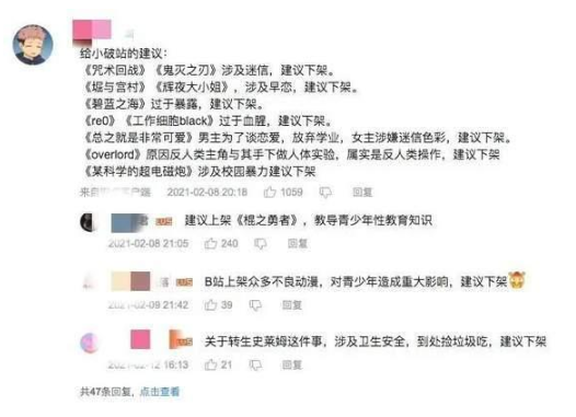 用户列举多部其他番剧可以下架的理由,暗讽B站下架《无职转生》 来源 / B站评论截图