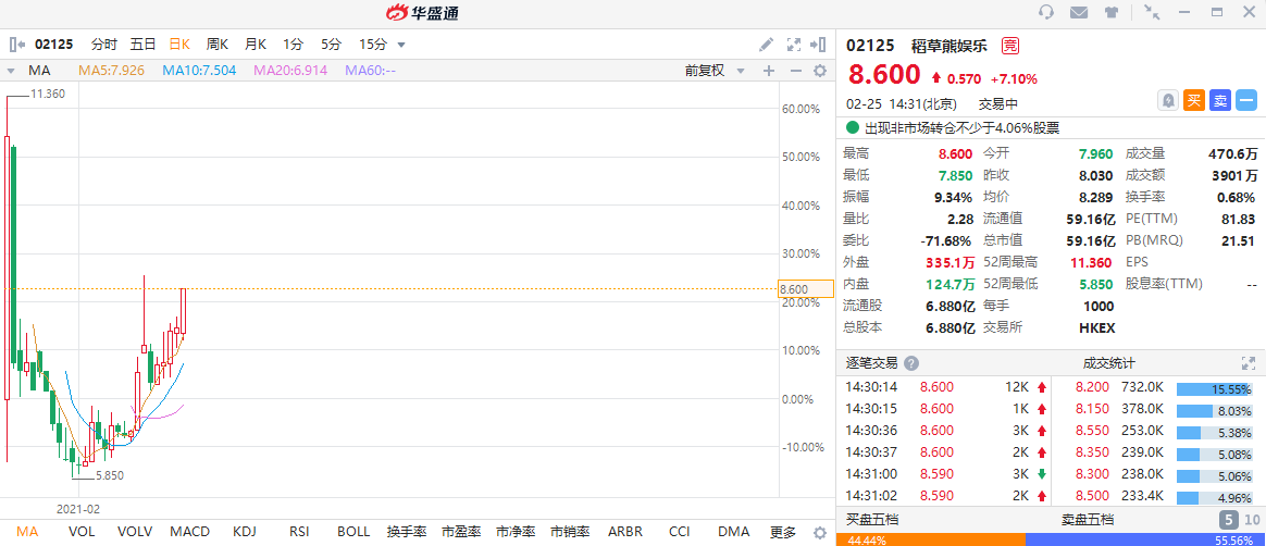 华盛资讯2月25日消息,次新股稻草熊娱乐本月持续上涨,月内累计涨超40%。截至发稿,稻草熊娱乐大涨7.1%,现报8.6港元每股,暂成交3901万,当前总市值为59.16亿港元。