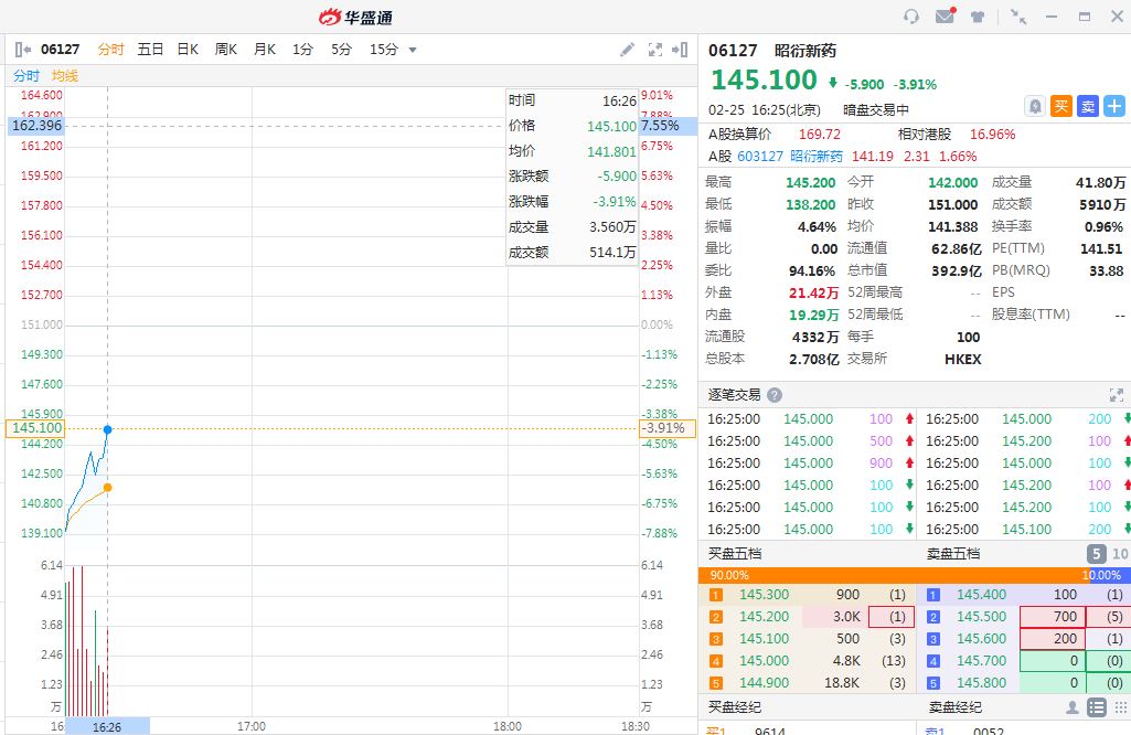 华盛资讯2月25日消息,昭衍新药(06127)今日16:15-18:30进行暗盘交易,目前该股跌幅收窄至3.91%,开盘一度跌超7%。预期该股明日正式上市。