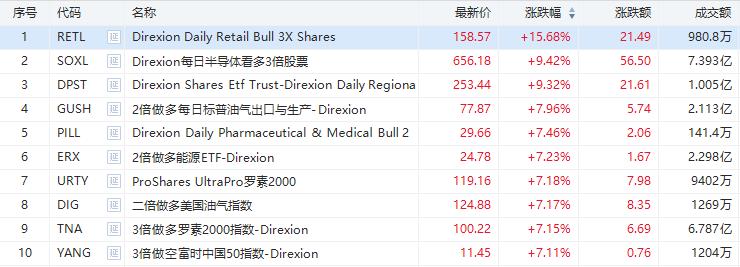 周三美股三大指数低开高走,道指突破32000点,创历史新高。从ETF涨幅榜来看,涨幅居前的ETF主要与做多ETF相关。其中,每日三倍看多半导体的ETF大涨9.42%,成交额7.39亿美元;2倍做多每日标普油气出口与生产的ETF涨幅为7.96%,成交额2.11亿美元。