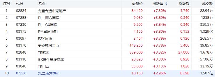 看多恒指相关ETF一扫昨日阴霾,南方两倍看多恒指(07200.HK)涨2.56%,成交额2.63亿港元。