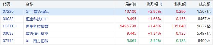 今日恒生科技指数结束五连跌,涨1.45%。其中,南方两倍做多恒科(07226.HK)涨2.95%,成交额1.51亿港元,恒生科技ETF(03032.HK)涨1.66%。