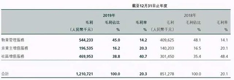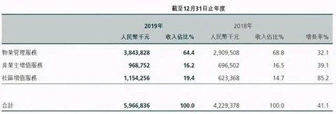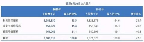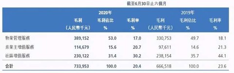 截至2020年6月30日,三大业务收入相比2019年同期均实现上升,物业管理收入增长25.4%,非业主增值服务上升20.8%,社区增值服务大涨40.8%,是三大业务中上升幅度最大的,这表明未来社区增值服务这一蓝海市场有着广阔的发展前景。这与目前物业公司纷纷将战略重心放在扩展社区增值服务市场、进行社区增值服务的大趋势相一致。