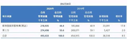 而与目前大多数物业管理公司不同的是,来自第三方的合同面积占保利物业在管面积的一半以上,市场化程度高。如图所示, 2020年6月30日,来自保利发展控股集团的合同管理面积占比44.4%,来自第三方的合同管理面积占比为55.6%。与此相对的是,行业内大多数公司在管面积的增长主要依赖地产母公司的面积输送,来自母公司的管理面积占总面积的七八成。第三方管理面积占比高也成为保利物业物业管理服务的一大特点,一定程度上有助于减少对母公司的依赖程度,保证收入增长的稳定性。