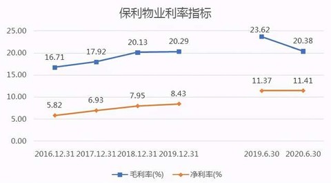 从利率指标来看,2020年前半年保利物业亦未达到平均标准。2016-2019年,保利物业毛利率和净利率均呈现稳定上升的趋势。但在2020年前半年,毛利率出现下滑,从2019年同期23.62%下滑至20.38%,净利率为11.41%,与去年同期基本持平。同行业对比,行业前半年平均毛利率和净利率分别为 29.8%和 15.6%,保利物业这两项指标均低于行业均值。