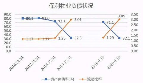 从负债状况来看,保利物业与物管行业“轻资产”的特点相吻合。2016-2019年,总资产负债率分别为80.3%、81.0%、72.8%、32.3%,2020年6月30日为32.1%。总负债中流动负债历年占比均在99%左右,其中流动负债主要由应付款项、合同负债及租赁负债构成,同时保利物业在2020年中报中作出说明,截至2020年6月30日,公司无借款或银行贷款。保利物业同时保有较高的流动比率,在2019年和2020年中期均大幅增长至超过3,说明保利物业资金流动性较高,有较好的流动负债偿还能力。