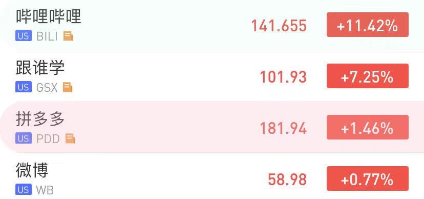 截至发稿,哔哩哔哩涨11.42%,跟谁学涨超7%,拼多多涨约1.5%。