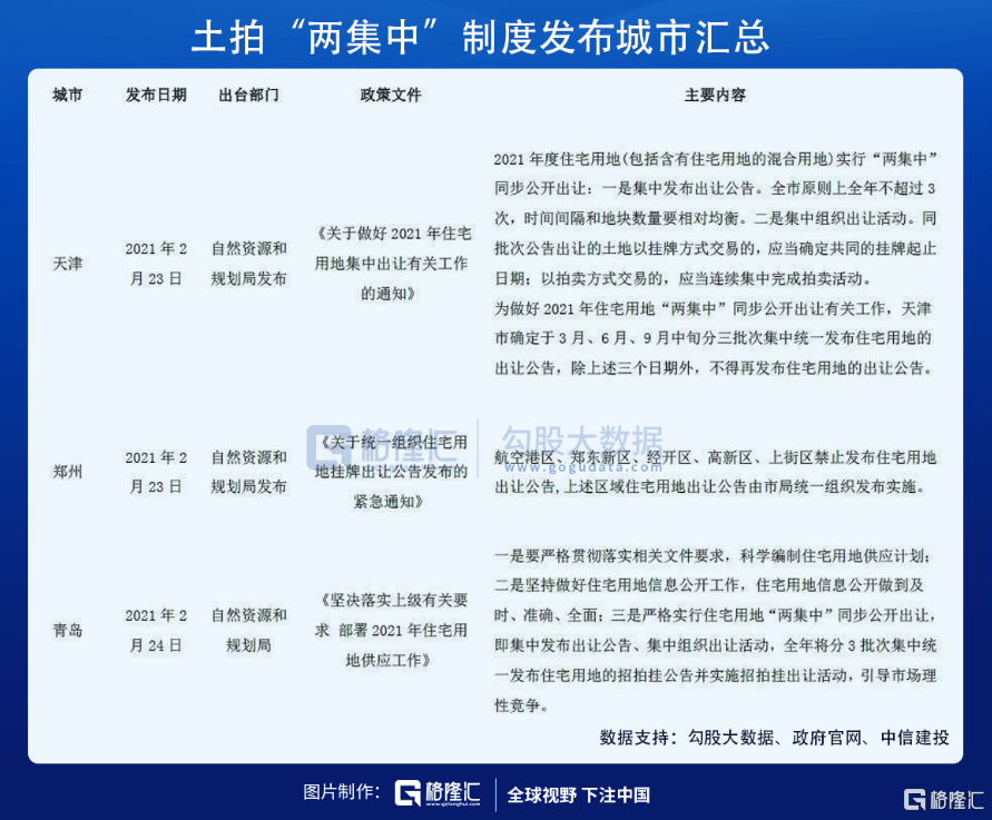 土地出让新规才是今天引爆地产股重磅导火索。就在2月23日-24日期间,天津,郑州,青岛3个城市的自然资源和规划局陆续发布住宅用地出让公告,要求住宅用地实行“两个集中”的新规定:一是集中发布出让公告,并且全年住宅用地出让不超过3次;二是集中组织出让,以挂牌方式交易的应该确定共同的挂牌起止日期;以拍卖方式交易的,应当连续集中完成拍卖。