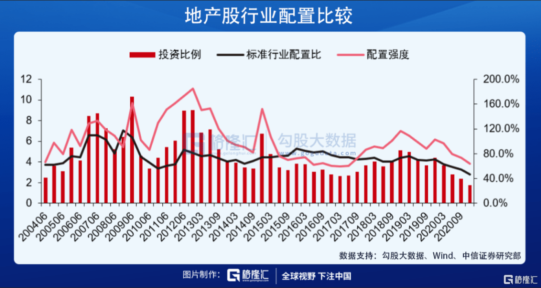 同样的,在A股市场,金融和地产的占比也非常之高。2020年第四季度,公募基金一共持有A股地产股票市值900多亿,配置比例不到2%,创出历史新低,而资金的行业标准配置比例是2.8%,还有1%的增量配置空间。