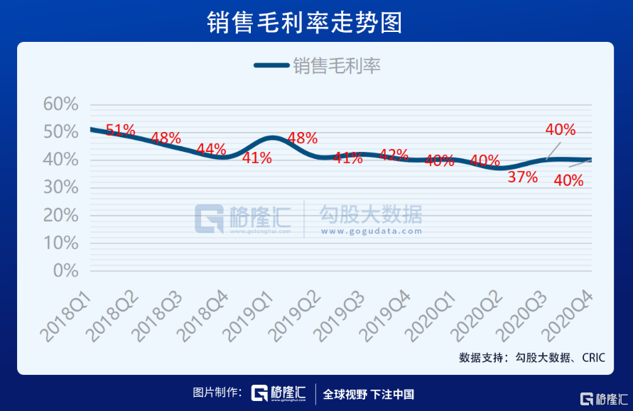 其次就是销售利润率。2018年Q1整体房企的销售毛利润是51%,到2020年Q2降到37%;从2020年Q3,Q4开始反弹,销售毛利率上升到40%。销售利润率与拿地利润率又是高度相关的,2020年下半年房企盈利空间的改善主要是因为高地价项目的占比下降。