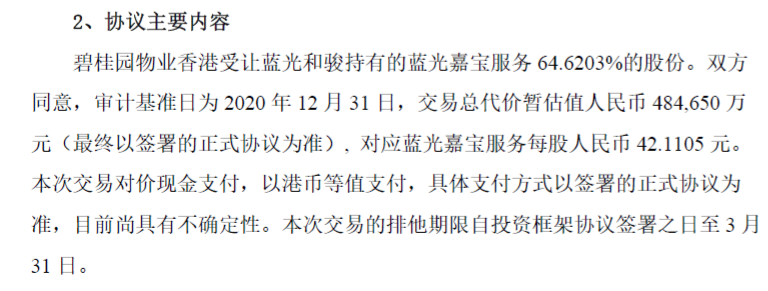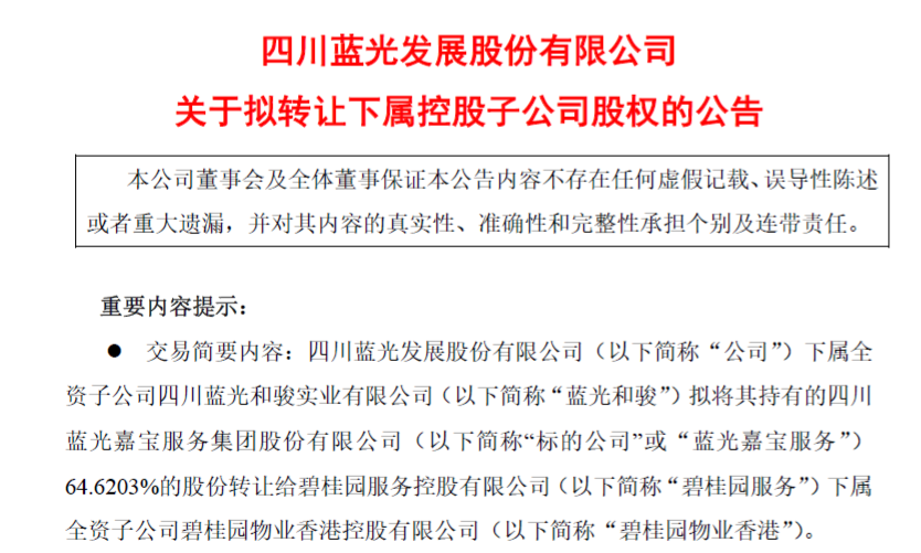 刚刚,蓝光发展发布公告,拟将其全资子公司持有的蓝光嘉宝服务64.623%的股份转让给碧桂园服务,本次交易对价总代价暂估为48.465亿元。