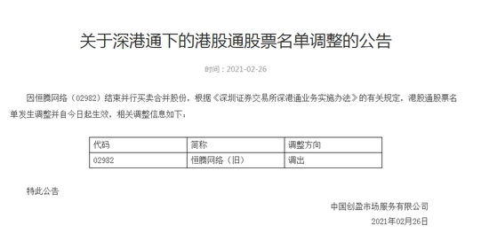 2月26日消息,深交所公告,港股通股票名单发生调整并自今日起生效,调出恒腾网络。