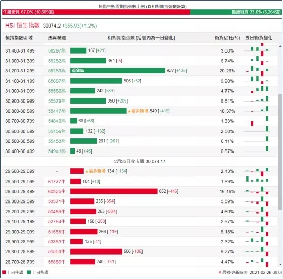街货分布方面,至周四,恒指牛证街货量有所减少,主要贴价区间在收回价29200点至29700点之间,相当约1578张期指合约;恒指熊证街货在收回价30400点至30900点之间,相当约1056张期指合约。