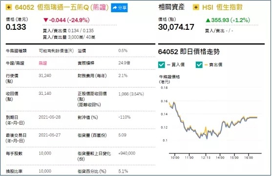 2、看错方向:恒指瑞通一五熊(64052.HK),周四下跌24.9%。