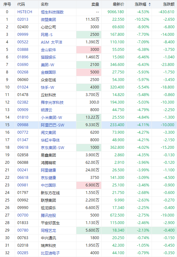 其他成分股,网易跌超7%,美团跌超6%,快手跌超5%,小米、阿里跌超4%,中芯国际跌超3%,腾讯跌超2%。