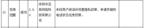 在45款游戏类App中,隶属于深圳市豆悦网络科技有限公司的APP龙珠觉醒(版本号:2.9.0)存在以下侵害用户权益问题:未经用户阅读并同意隐私政策,申请存储和电话状态信息权限。