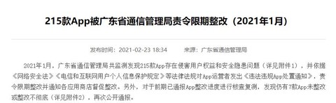 中国经济网北京2月26日讯 (记者 徐自立 马先震)2月23日,广东省通信管理局发布消息《215款App被广东省通信管理局责令限期整改(2021年1月)》。2021年1月,广东省通信管理局共监测发现215款App存在侵害用户权益和安全隐患问题,并依据《网络安全法》《电信和互联网用户个人信息保护规定》等法律法规对App运营者发出《违法违规App处置通知》,责令限期整改并通知各应用商店督促整改。另外,对于前期已通报App整改进度进行核查复测,发现仍有7款App未整改或整改不彻底,再次公开通报。