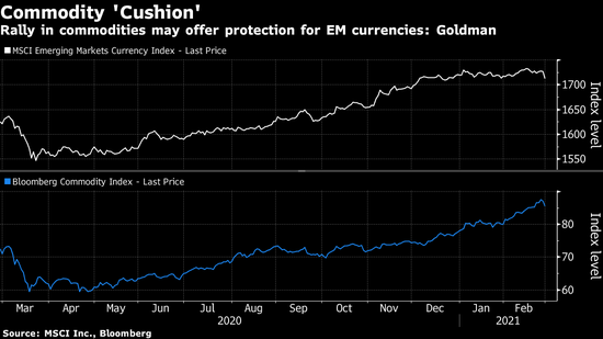 高盛表示,虽然美国国债收益率劲升打压了新兴市场货币,但今年的大宗商品价格涨势可能提供一些保护。
