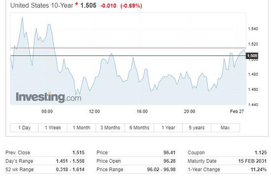 数据发布后,美债收益率一度短线走低,随后重回1.50%一线,日内整体仍下跌。